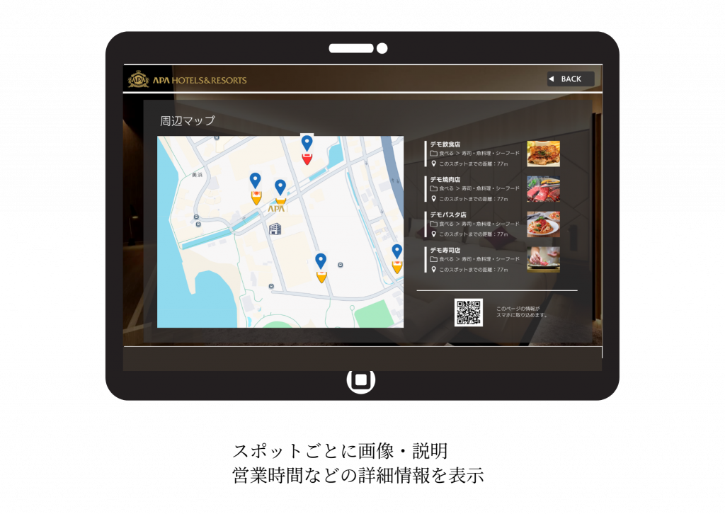 レストランの営業時間や館内施設の案内、観光情報、Wi-Fiパスワードなど、知りたい情報にすぐアクセス可能。